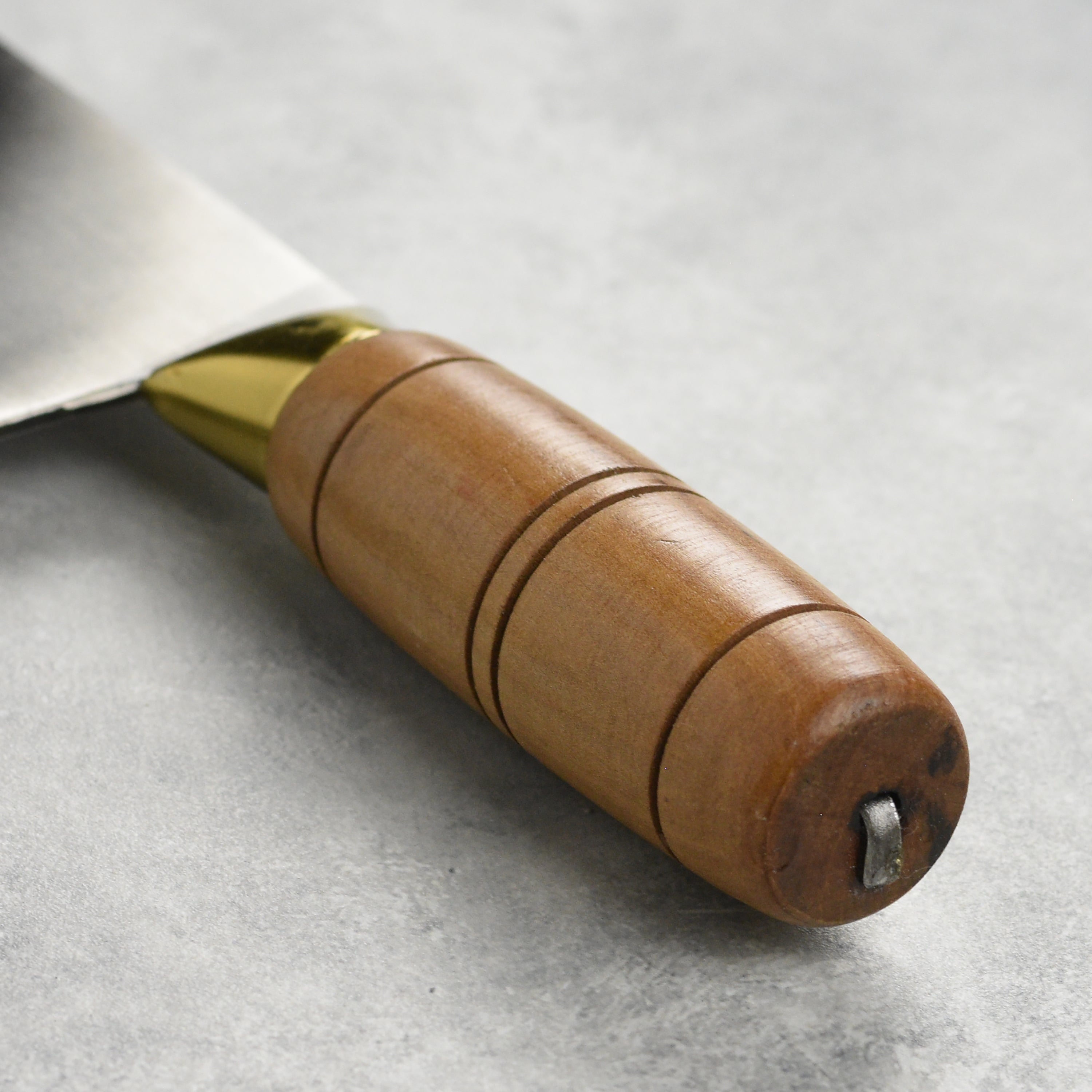 - Barrel shaped wood handle with brass bolster and stick tang that's folded over at the handle end