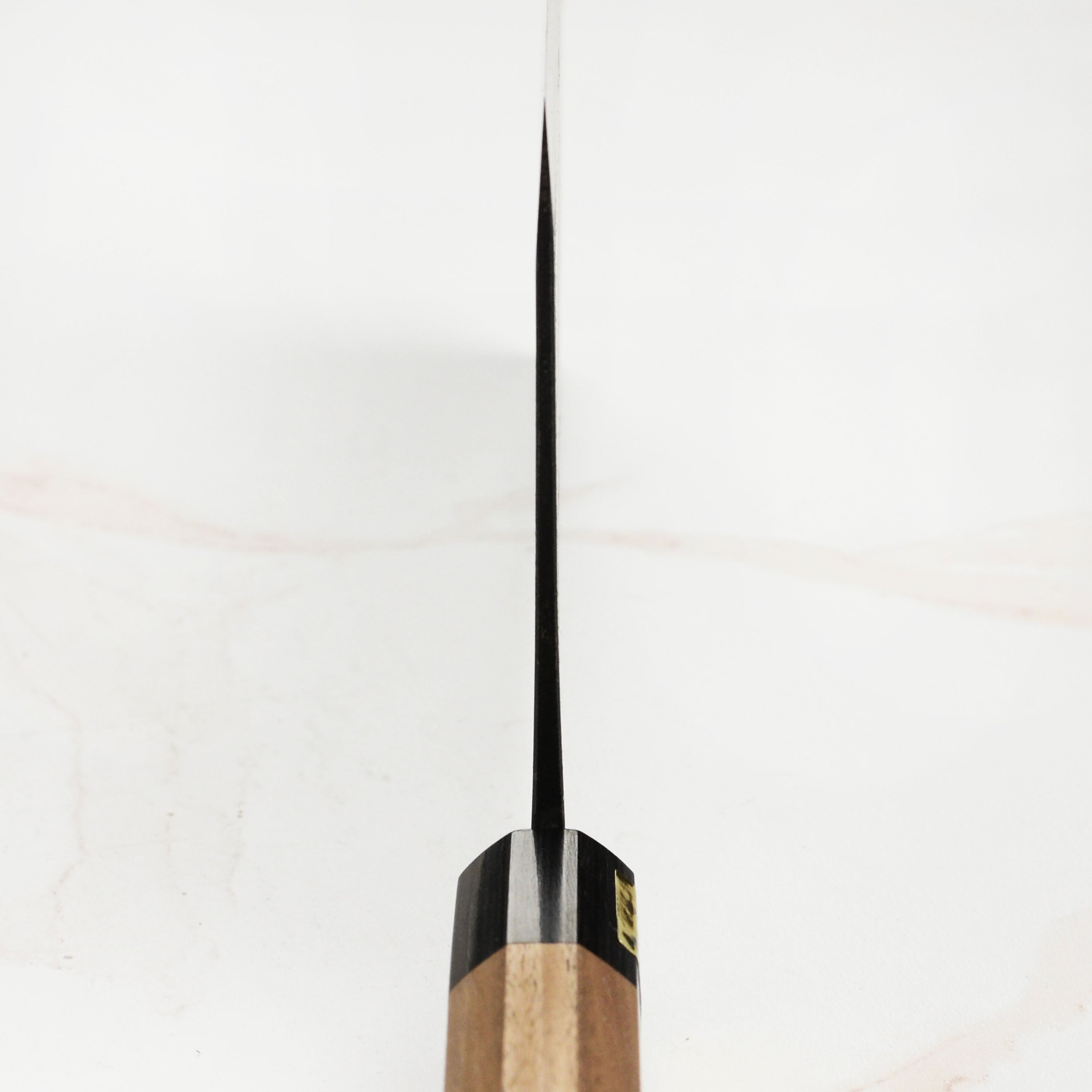 Moritaka selects the highest quality Aogami Super steel in the YSS range for the core carbon steel because of the extra durability and longer edge retention. Aogami Super steel is made by adding chromium and tungsten to Shirogami (white steel, the purest of the carbon steels), which makes the material more durable and provides corrosion resistance. Each knife has slightly different appearance and size because the blade is hand-forged and the handle is walnut wood. Double-bevel edge is more robust than a single edge and less prone to chip or nick because both sides of the edge are equally supported, so the hard core of steel is supported on both sides. Easy to use since the cutting edge cuts straight down without wanting to twist. The tang of the knife is made of stainless steel.