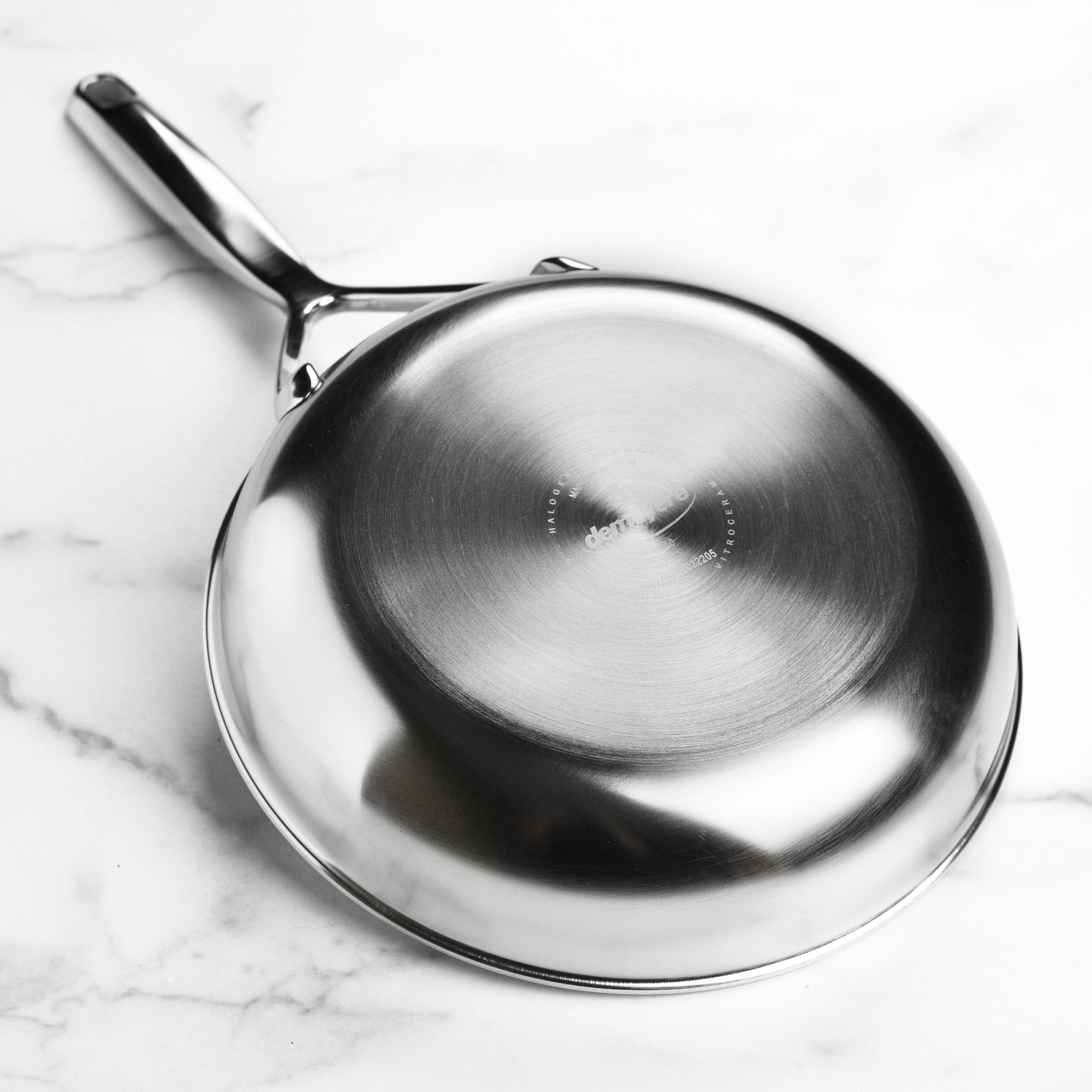 - Durable 5-ply clad construction is 3-mm thick throughout for quick and even heating; 18/10 stainless steel interior, pure aluminum, aluminum alloy core, pure aluminum, and a satin finish 18/0 stainless steel magnetic exterior