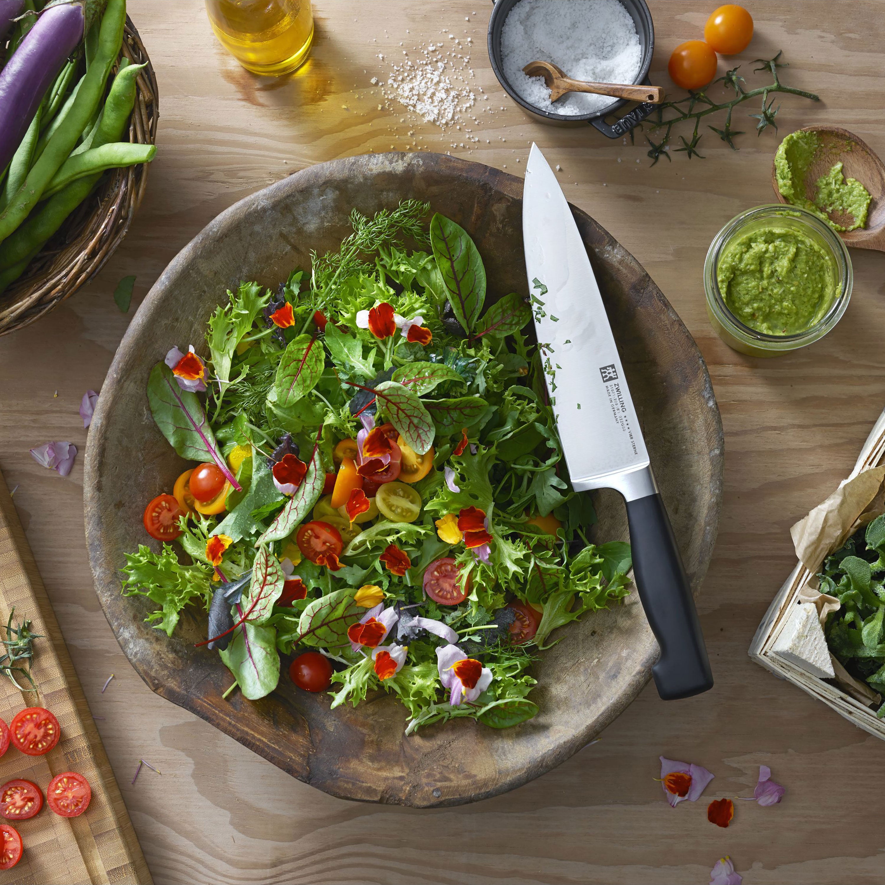 The Zwilling Four Star Chef's Knife is perfect for slicing, dicing, chopping, and mincing of fruits, vegetables, meats, fish and even smashing garlic. Zwilling Four Star series is one of the world's most popular knife lines. Four Star knives were designed and developed in close cooperation with renowned professional chefs. The result was a fully forged knife with a unique molded handle. This entire collection features precision forged knives made from a single piece of Zwilling exclusive high carbon stainless steel. As a result, the knives have improved quality consistency, lasting sharpness, and perfect geometry. In addition, the steel blade goes through a special ice-hardening process called Friodur. This process changes the molecular structure of the steel improving the cutting properties providing a remarkably sharp blade and ensures a long lasting cutting edge. Each knife is hand sharpened, polished and laser controlled to assure the cutting edge is accurate along the full length of the blade. First introduced in 1976, the Four Star range today is still one of the world's most popular knife series. The Four Star series features high impact polypropylene handles that are permanently bonded to the knife blades without any gaps. These comfortable, molded handles are break-proof, sanitary, and colorfast. In addition, the super bolster and full tang provides weight, insures safety, and adds balance. Made in Germany with a lifetime warranty.