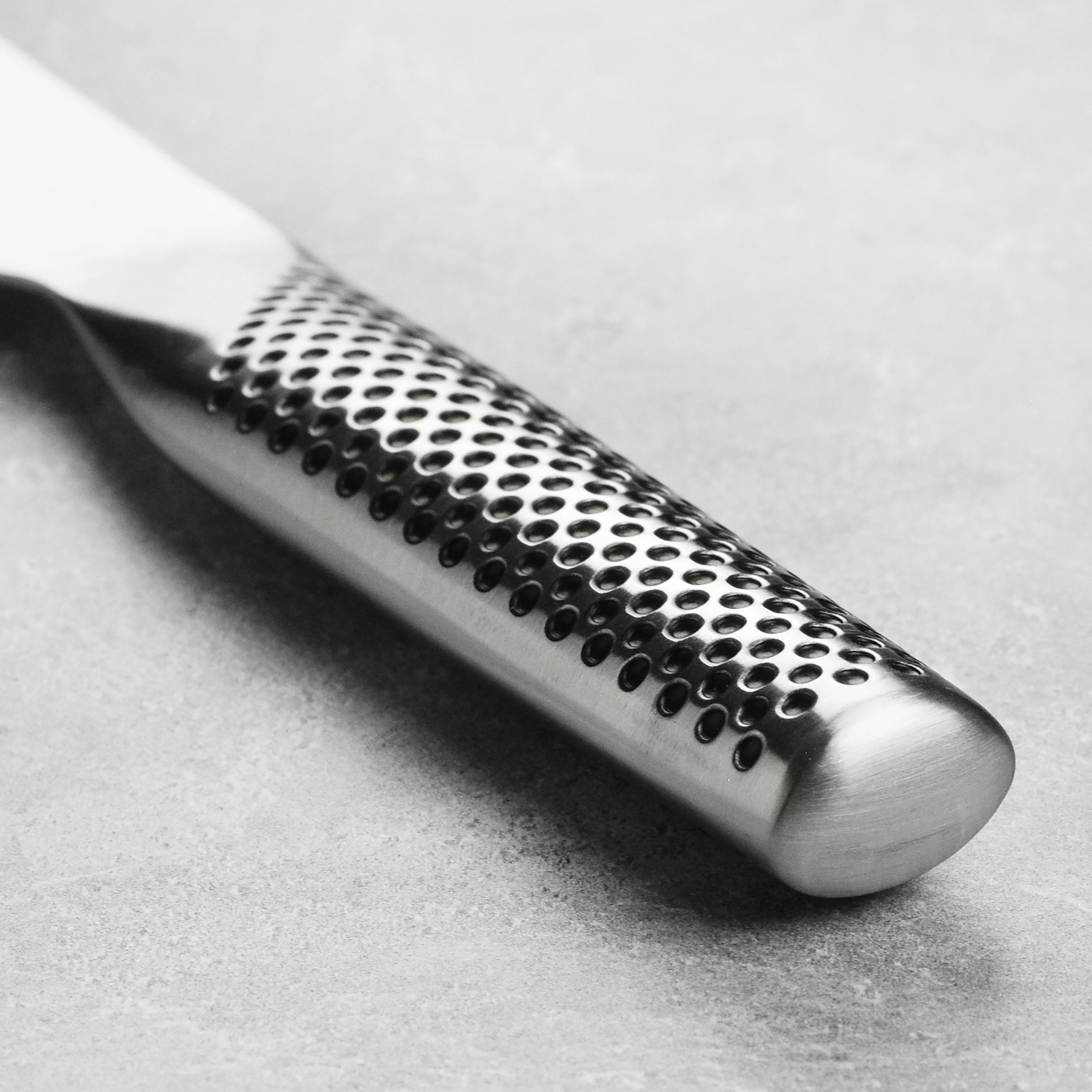 First, I like Global knives, partially because the handles fit my hand well. I know a few people who don't feel comfortable with them. As with any brand of knife, I recommend trying, as a bad grip can be dangerous.
