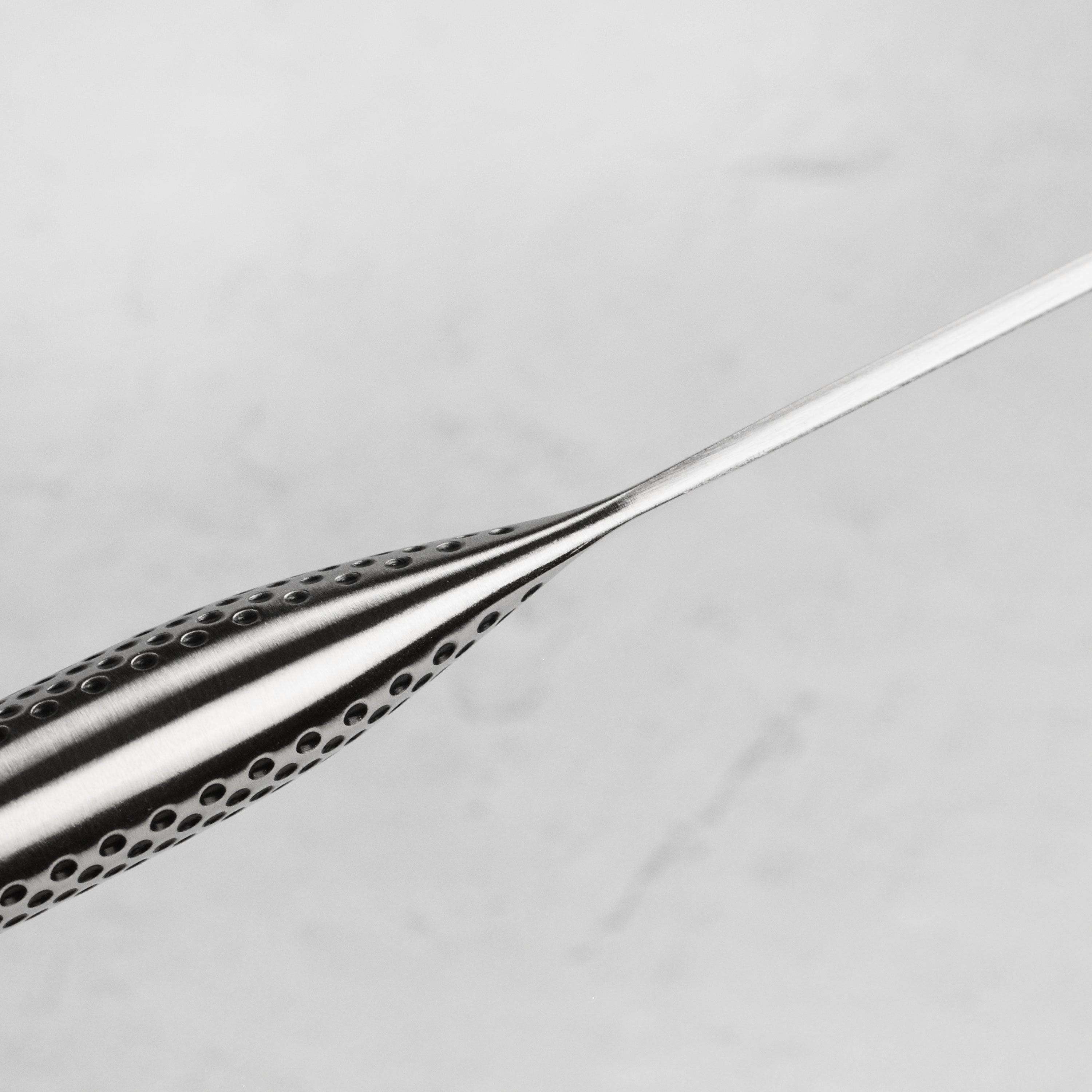 The Global Bread Knife is great for slicing foods with thick crusts or rinds like artisan breads and melons or gourds. It also cuts through soft bread without crushing it. Global knives contain two innovative features, their edge and the way they are balanced. The most important detail of any knife is its edge, and the Global edge is truly its signature. Global knives are sharpened or ground steeply to a point, and to an acute angle while resisting rust, stains and corrosion. The serrated edge results in a dramatically sharper knife which stays sharper longer. The edge on a Global knife is so large and prominent that it is easily seen with the naked eye and extends a quarter of an inch or more up from the tip of the knife.