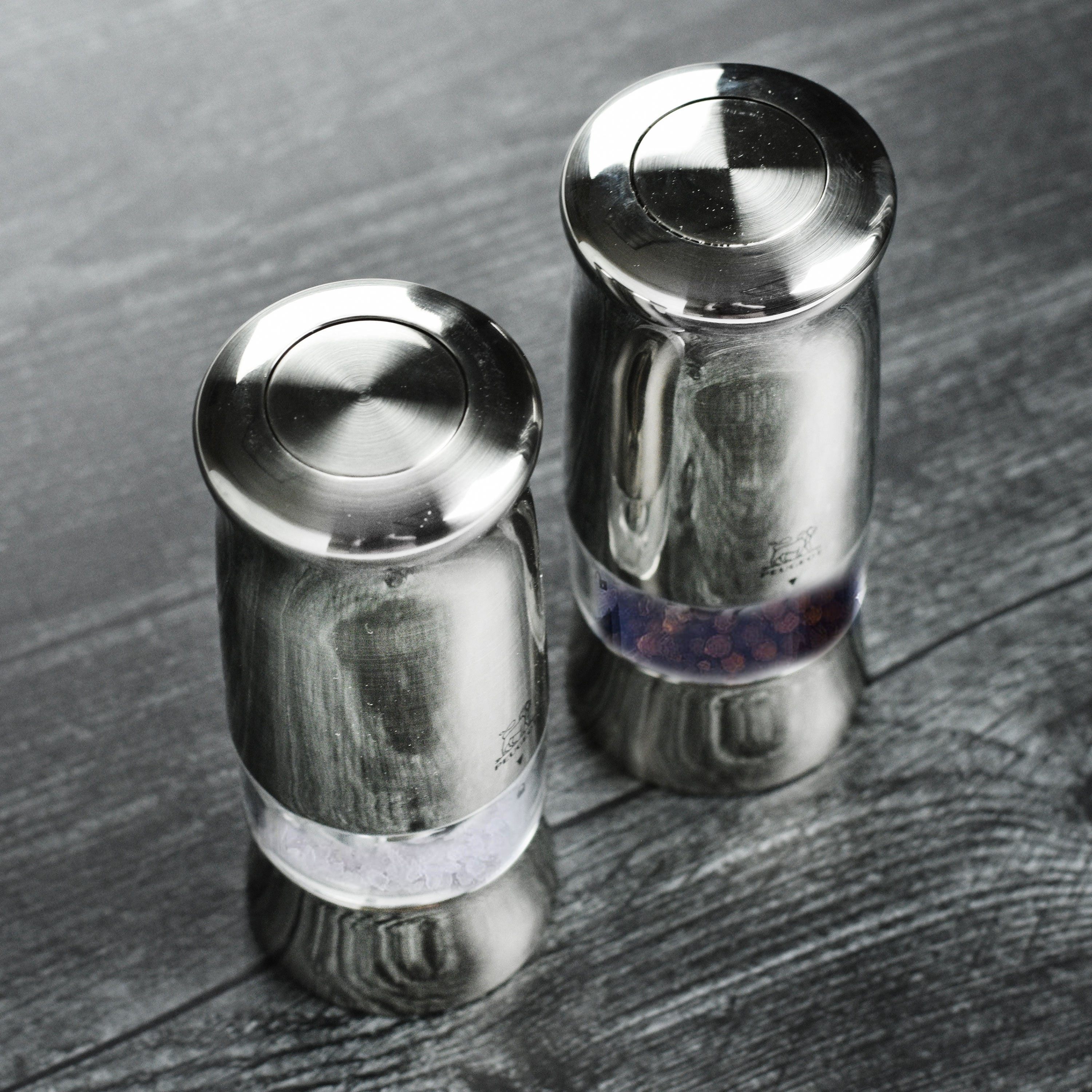 - The pepper grind is adjusted with the thumb-wheel under the mill, salt mill is fixed at a medium grind