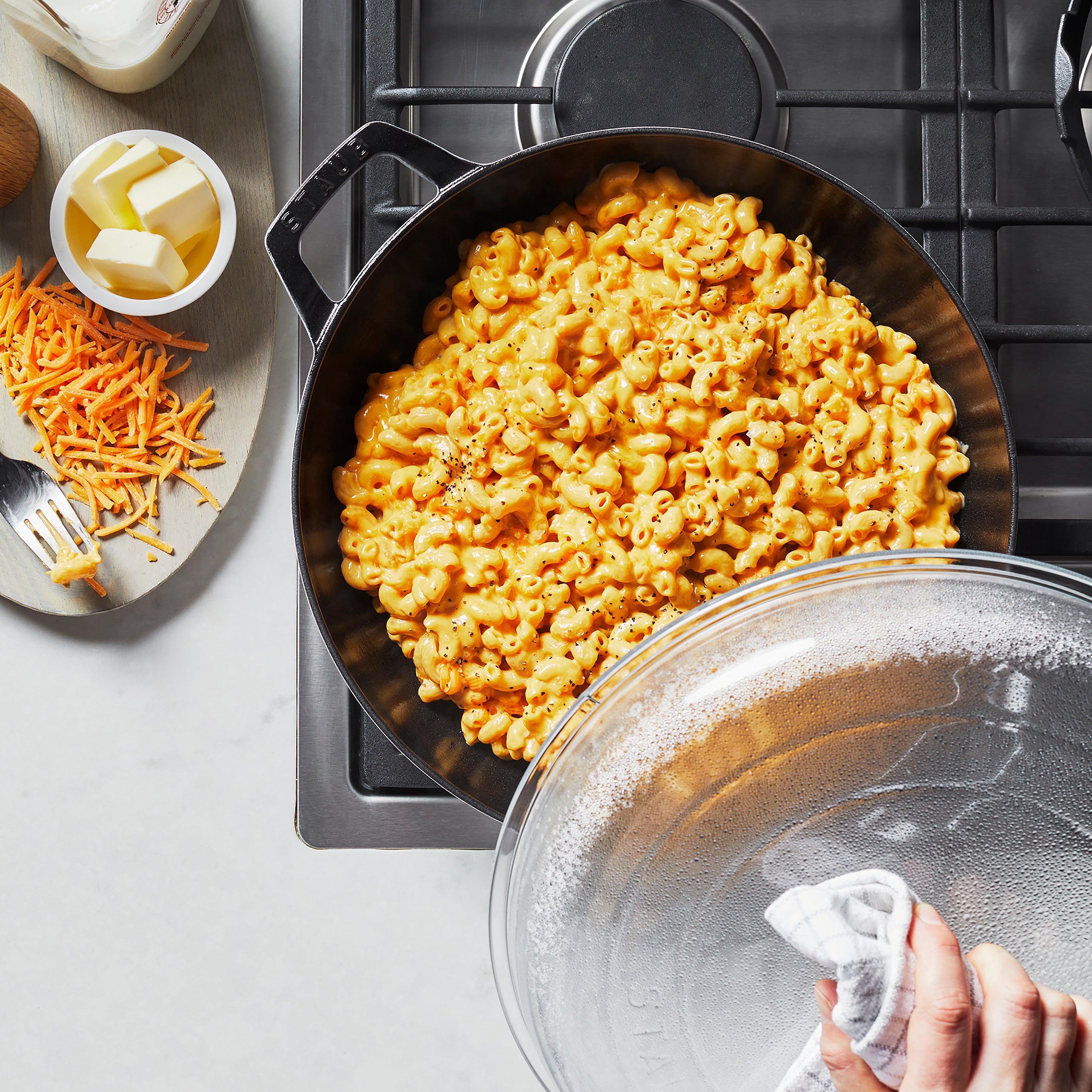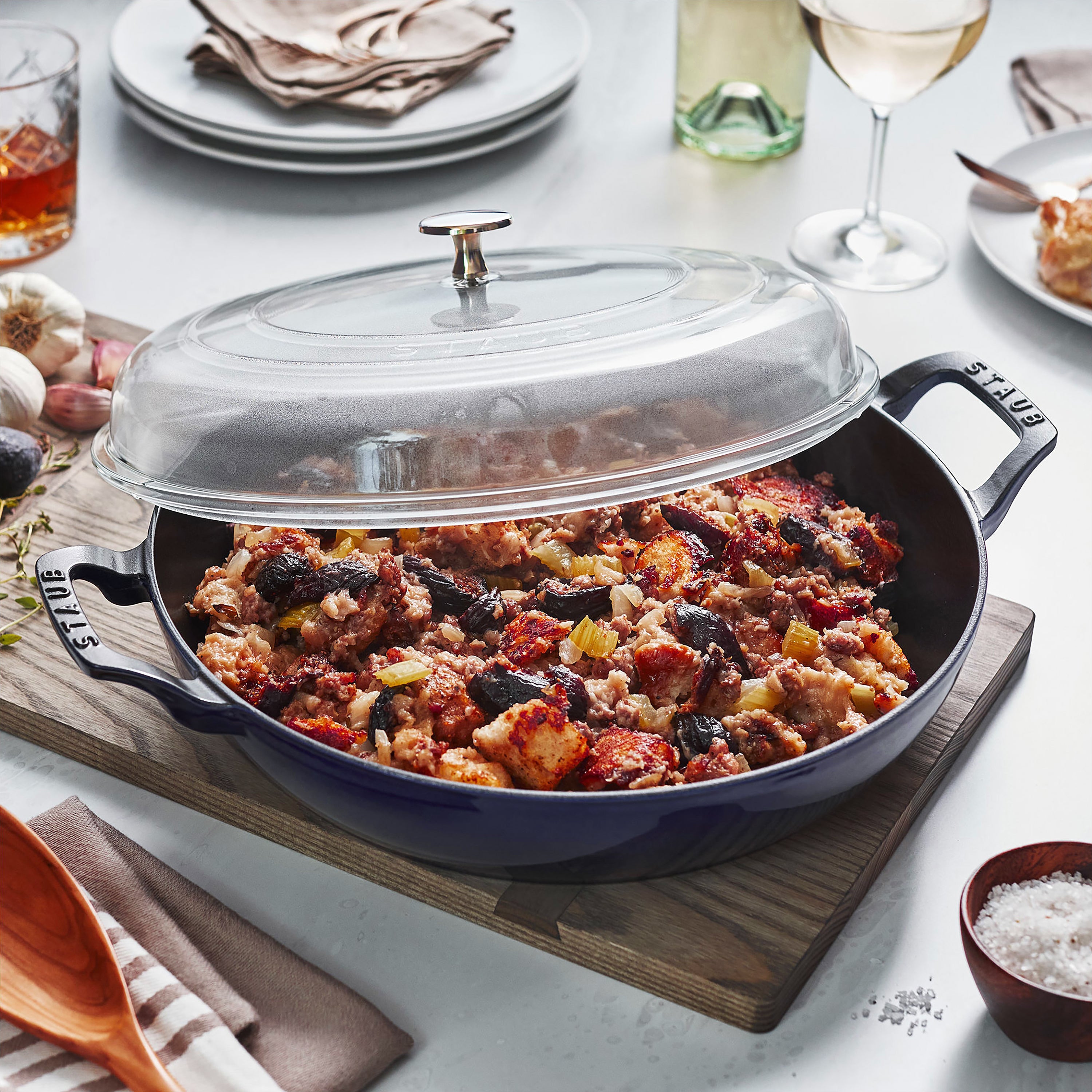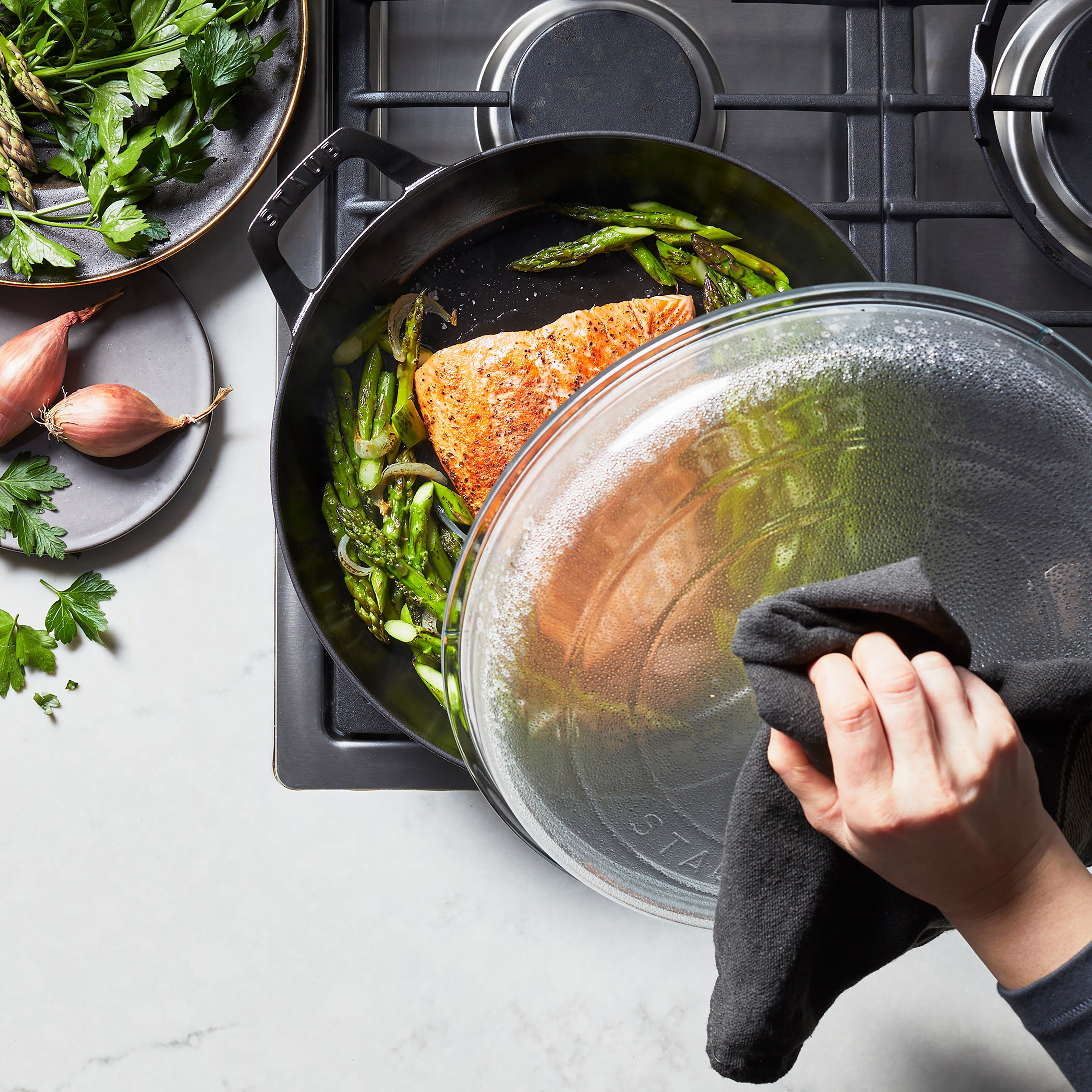 The Staub 3.5-quart Braiser with Glass Lid is the perfect cookware for one-pot dinners, slow-cooked braises, and simmered soups. The heavyweight, domed glass lid locks in moisture and accommodates large cuts of meat. Staub cast iron possesses exceptional heat-retention qualities, so the pot heats evenly throughout. The textured black matte enamel interior ensures exceptional browning and requires no seasoning.