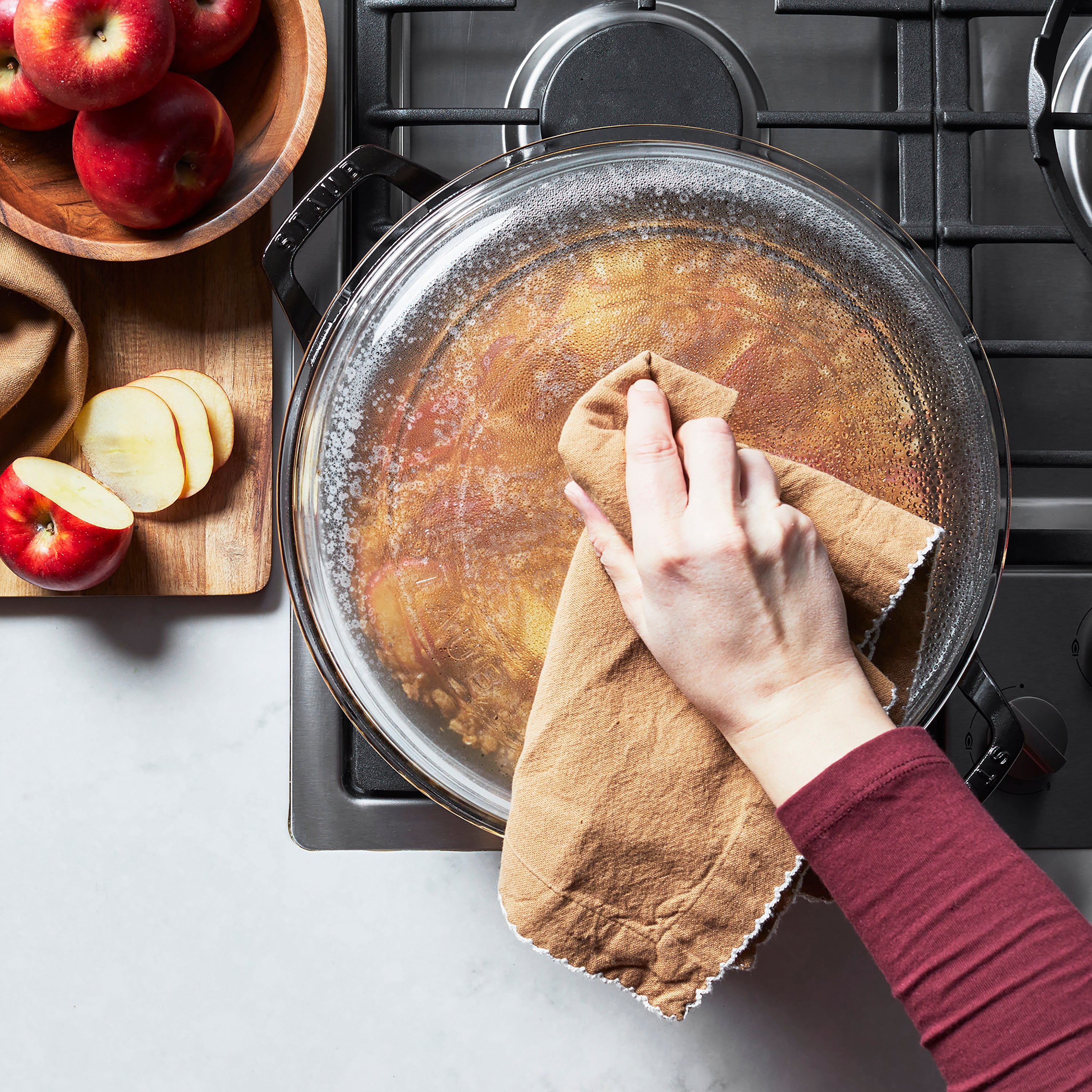 • Tight-fitting glass lid with nickel-plated knob retains moisture