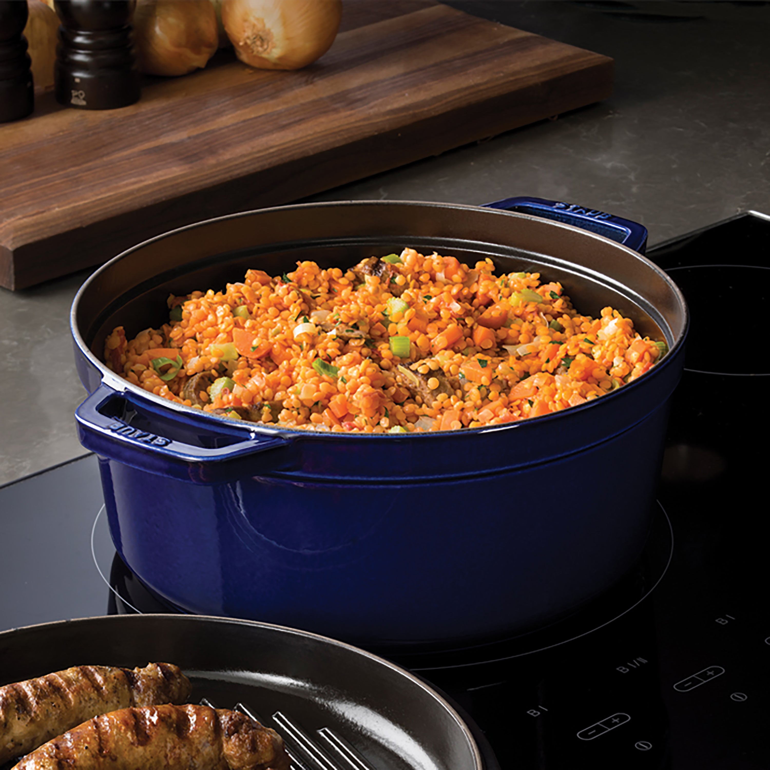 - Enameled cast iron for exceptional heat-retaining qualities from oven to table
