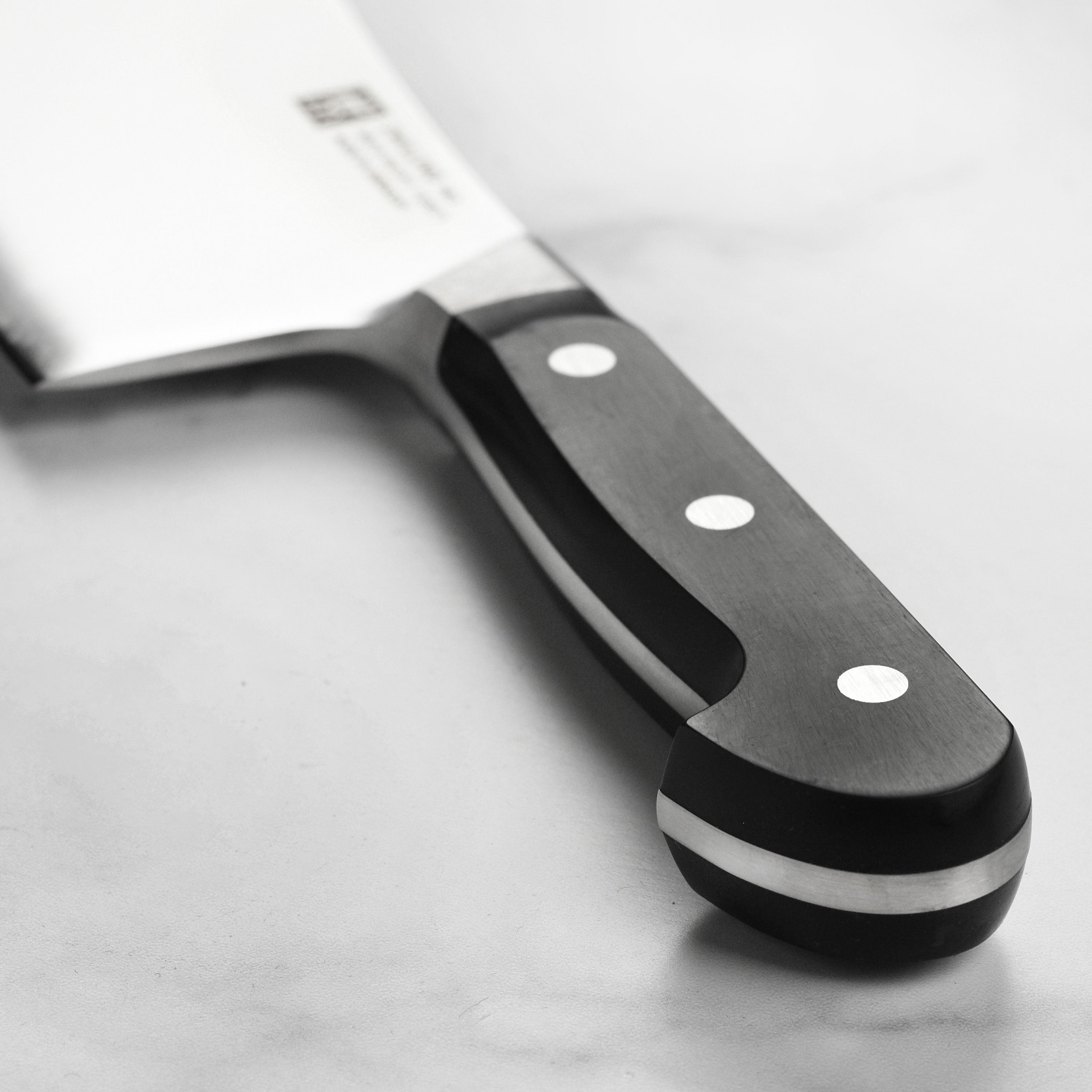 - Full tang with curved bolster provides solid grip and balance; comfortable and traditional 3-rivet resin handle
