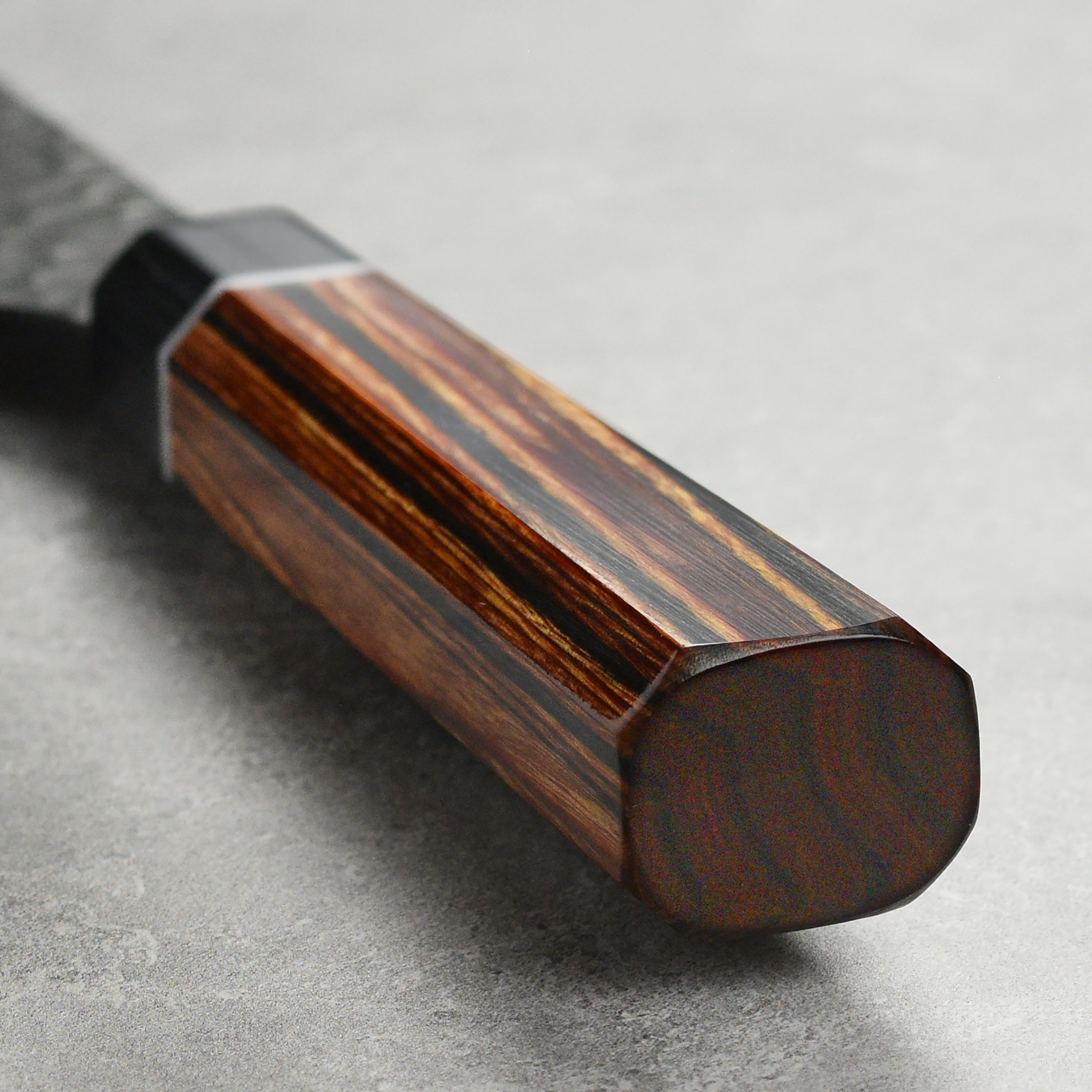 - Traditional Japanese octagonal two-tone pakkawood handle with white ring is ergonomically shaped for a secure grip and is permanently and seamlessly installed to the blade