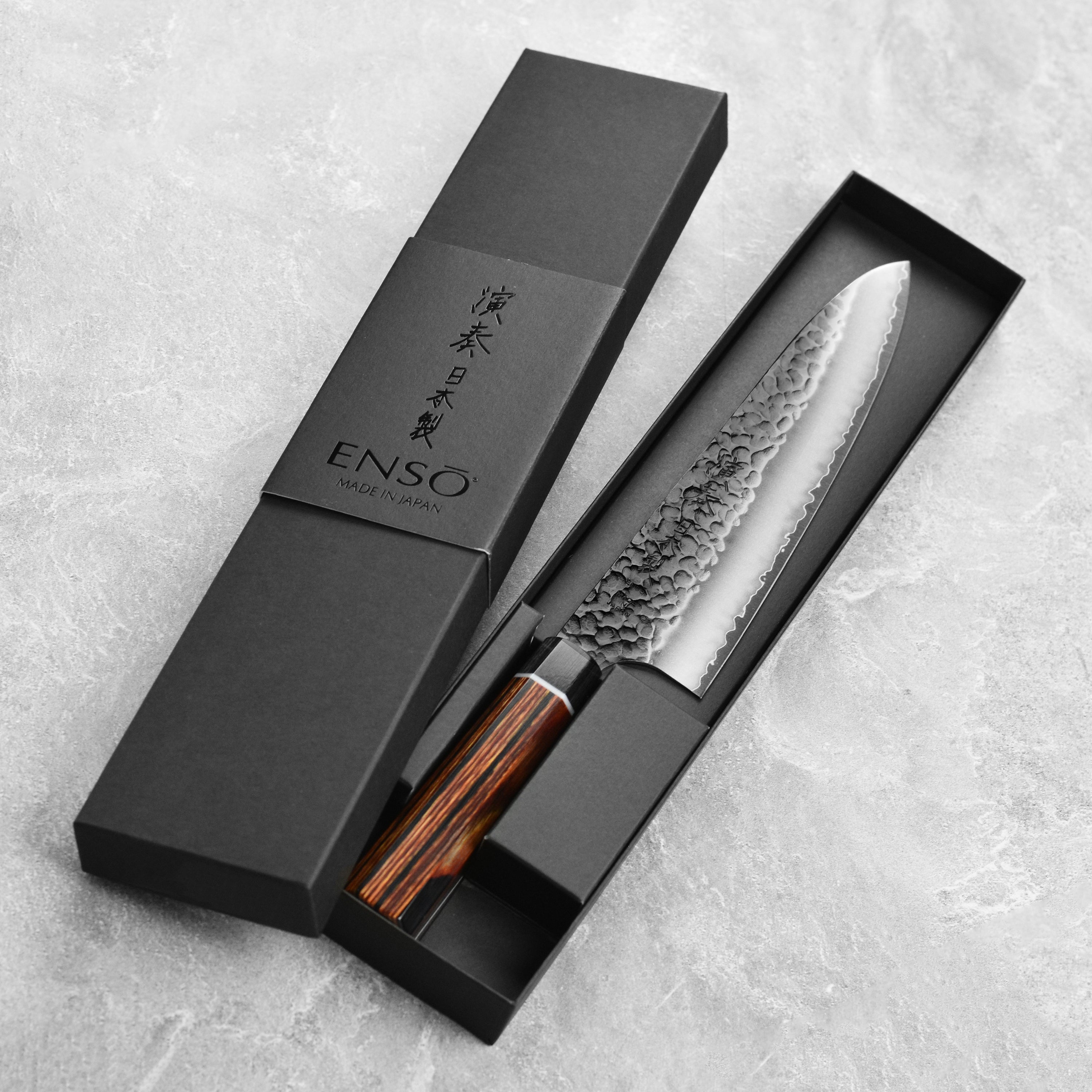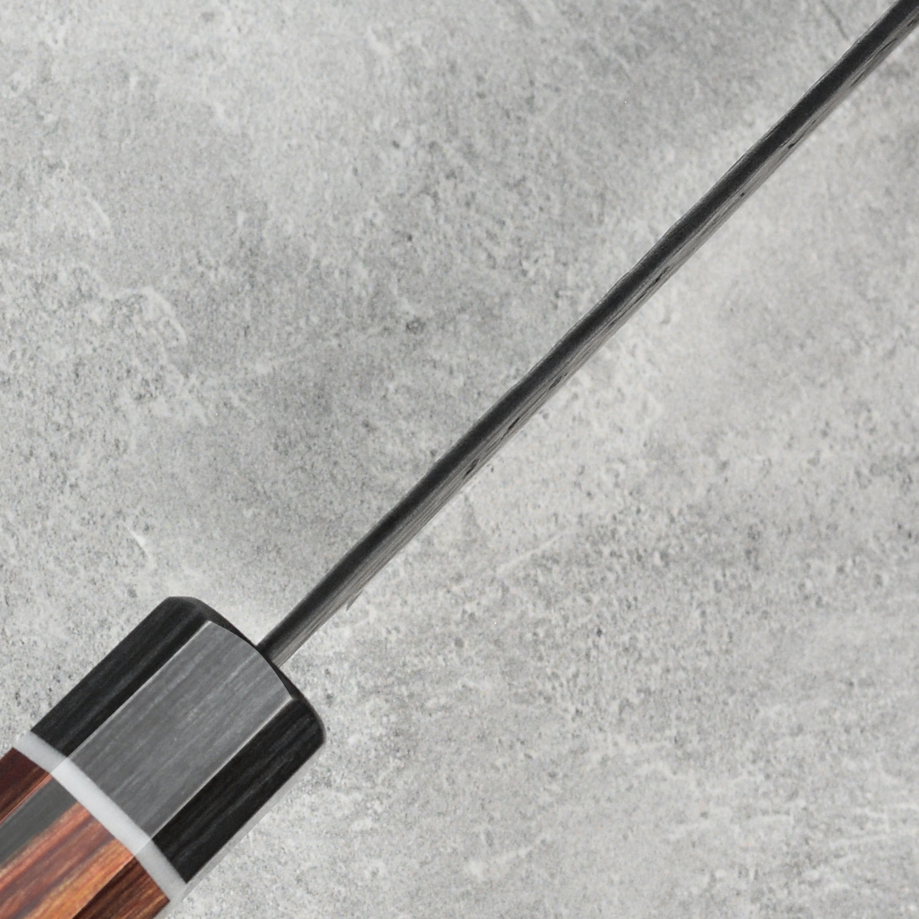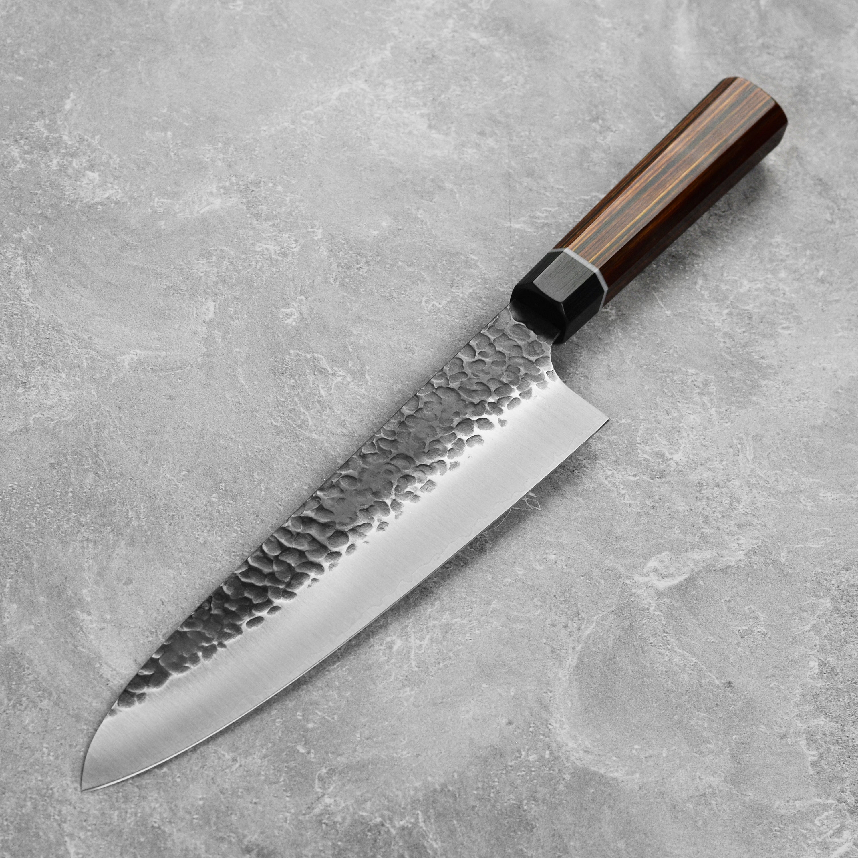 - 3 layer blade with SG2 core and hammered ("tsuchime") texture with a black ("kurouchi") finish; the blade is then ground to a matte finish with a highly polished edge for a beautiful and long lasting appearance